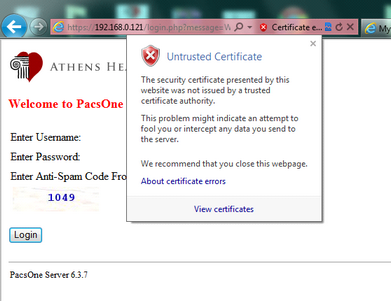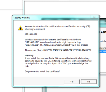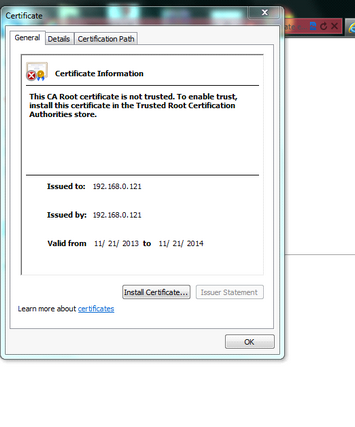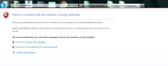 | 2. | For windows 7 machines, open a new tab, navigate to https://192.168.0.121. Click on the link for Continue to this website (not recommended). |