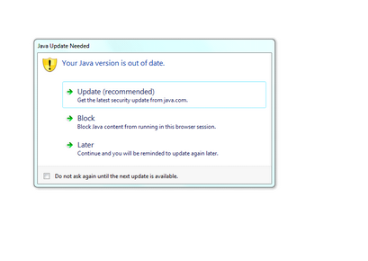Depending on the machine a window asking about your Java version. Click Do not ask again, then click Later.